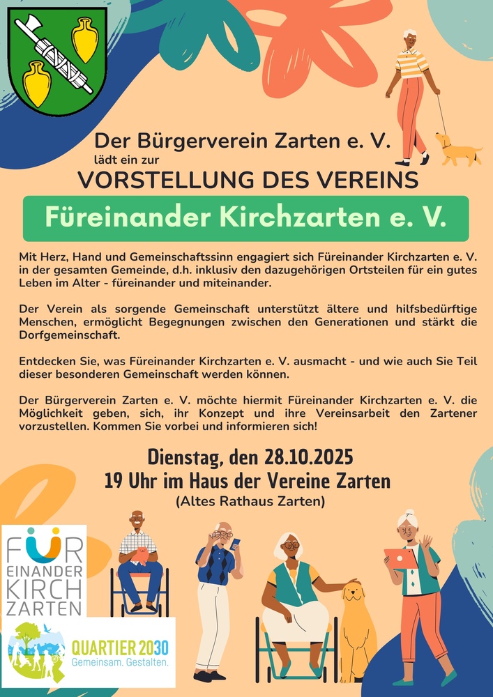 Die Gemeinde Kirchzarten unterstützt den Verein Füreinander Kirchzarten e.V. als wichtigen Partner für eine sorgende Gemeinschaft und ein gutes Leben im Alter – direkt vor Ort mit unseren Ortsteilen.Am Dienstag, den 28. Oktober 2025, lädt der Bürgerverein Zarten e.V. herzlich zur öffentlichen Vorstellung des Vereins in das Haus der Vereine Zarten (ehem. Altes Rathaus) ein.
